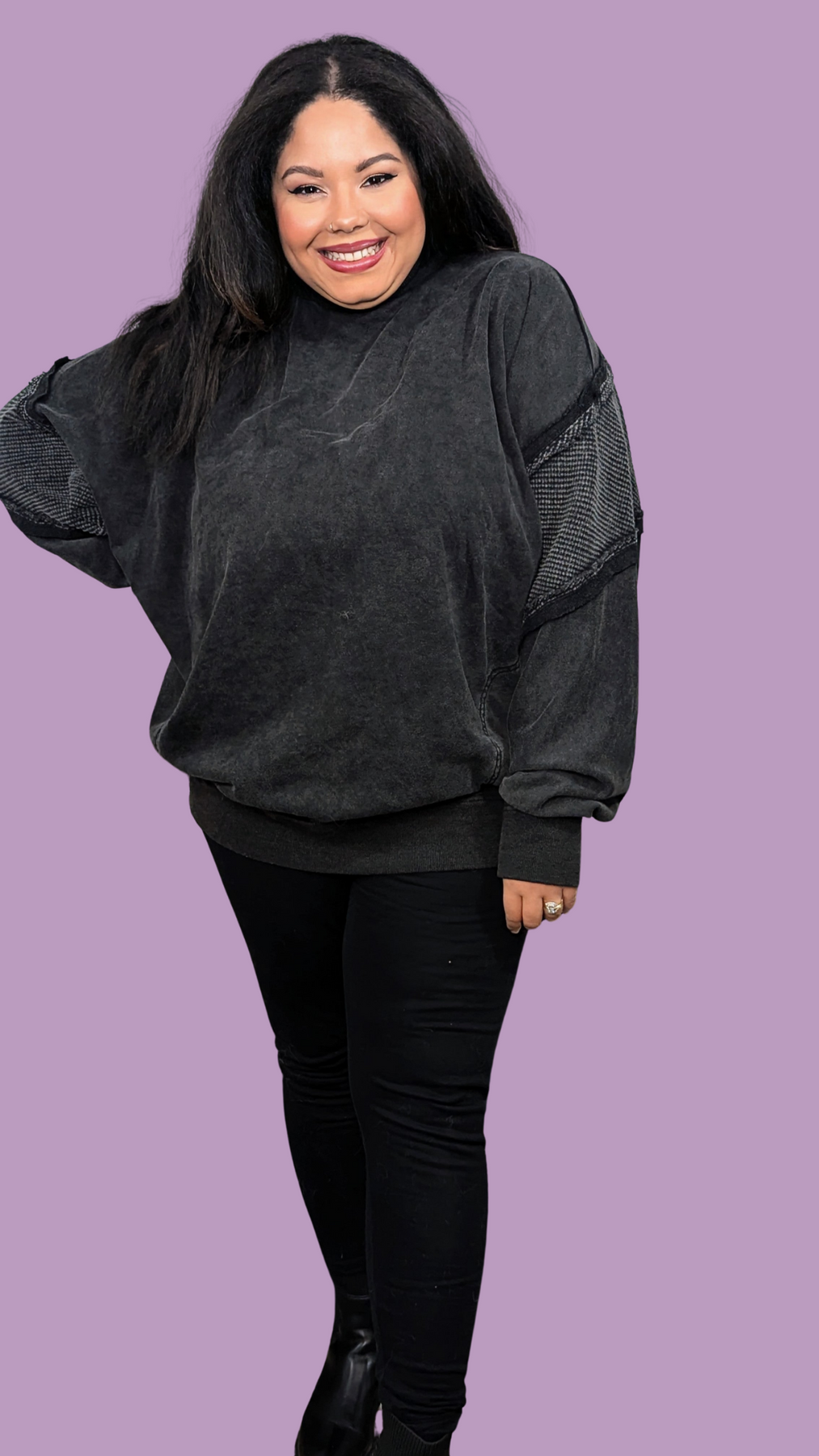 Experience the perfect blend of comfort and style with our mineral washed pullover! Featuring a relaxed fit, a unique funnel neck, and distressed details, this pullover is as fashionable as it is comfortable. The waffle-sewn fabric provides durability for long-lasting wear. Available in a versatile black color, it’s a wardrobe essential.